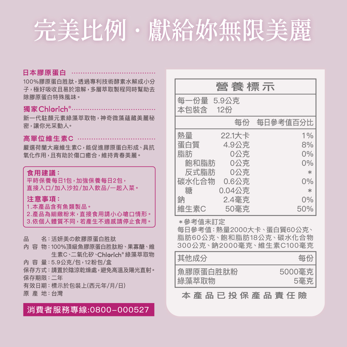 產品內容物:100%頂級魚膠原蛋白胜肽粉、果寡醣、維生素C、二氧化矽、Chlorich綠藻萃取物